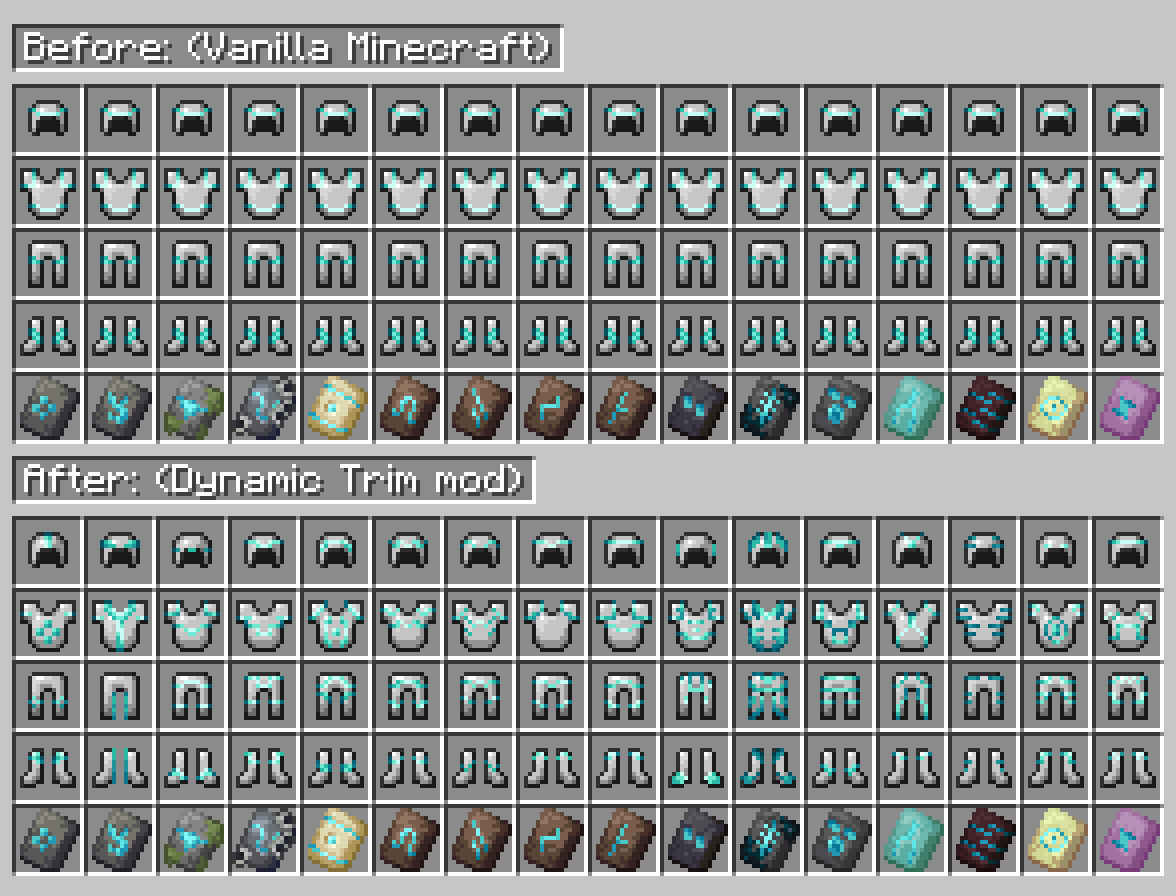 Dynamic Trim - данный мод добавляет динамическую отрисовку брони в Minecraft. Теперь броня с отделкой будет полностью отображаться в инвентаре. Если у вас есть несколько таких предметов, вы можете легко отличить их, не прибегая к их экипировке.