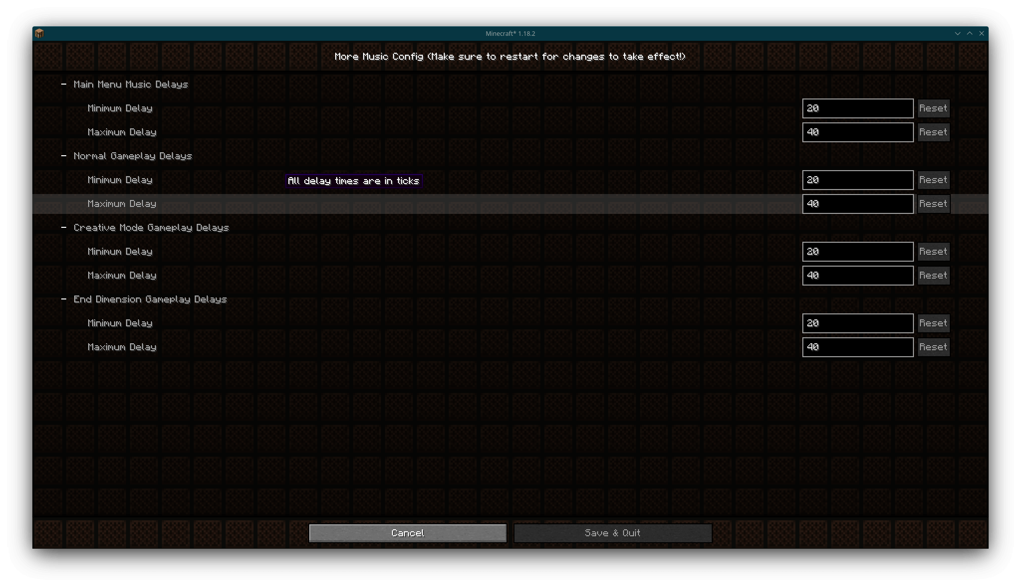 Минимальные и максимальные задержки (в тактах) между песнями для главного меню, обычного игрового процесса, творческого режима и окончания** могут быть настроены индивидуально.