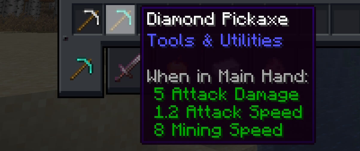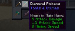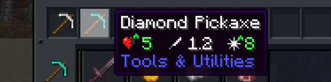 Mining Speed Tooltips - данный мод добавляет дополнительную строку информационного текста ко всем инструментам для копания, таким как кирки, топоры и лопаты, показывая пользователю фактическую скорость копания инструментом. Поскольку в "ванильном Майнкрафте" это обычно скрытое значение, его часто путают со скоростью атаки, и этот мод устраняет эту путаницу.