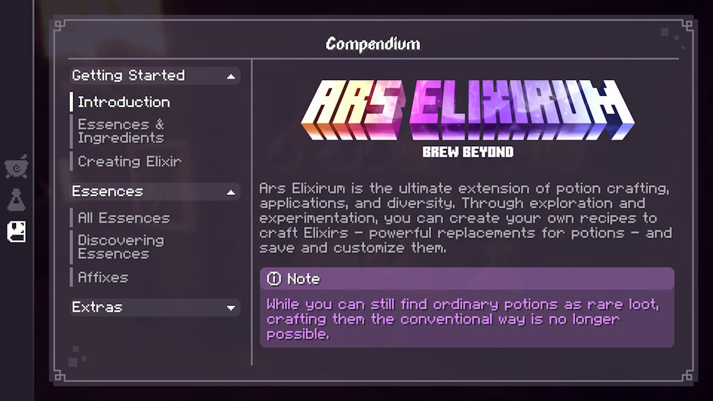 Ars Elixirum - данный мод идеальное дополнение к созданию зелий, их применению и разнообразию. Исследуя и экспериментируя, вы можете создавать свои собственные рецепты для изготовления эликсиров - мощных заменителей зелий - и сохранять их, а также настраивать.