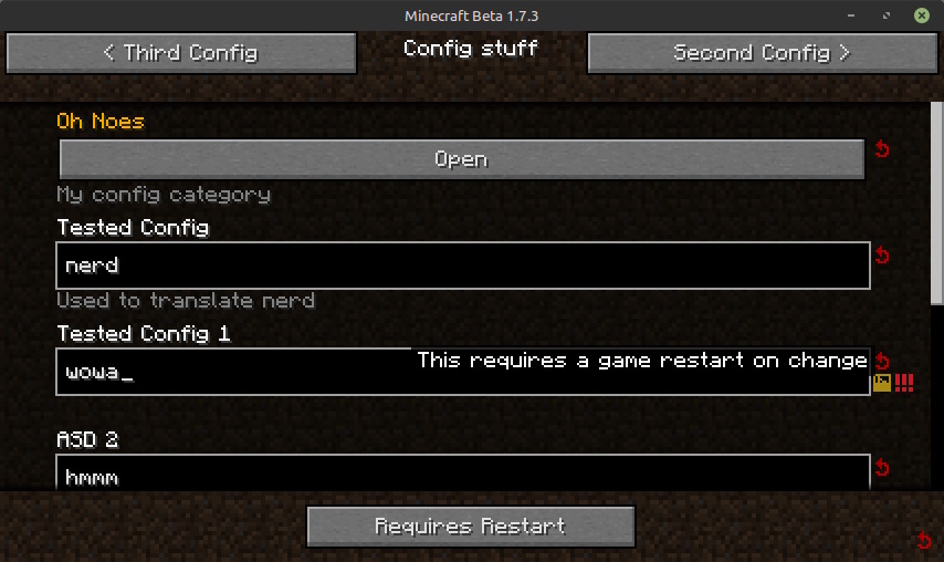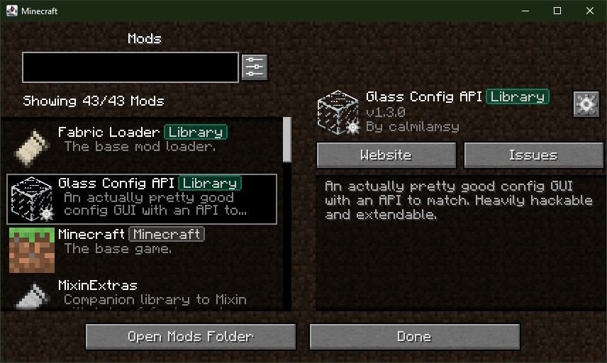 Glass Config API - данный мод является библиотекой, в значительной степени вдохновленный Cloth Config для бета-версии 1.7.3, который упрощает добавление конфигурации в ваш мод.
