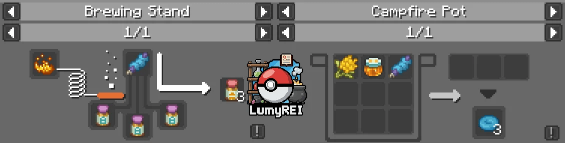 LumyREI - данный мод является дополнением, разработанным специально для Roughly Enough Items (REI). Оно обеспечивает полную интеграцию новых рецептов, представленных в Cobblemon 1.7+, включая Cobblemon Campfire Pot и Minecraft Brewing Stand, непосредственно в интерфейс REI.