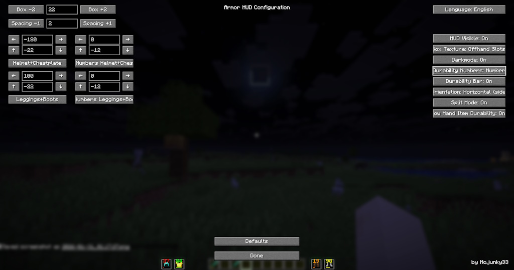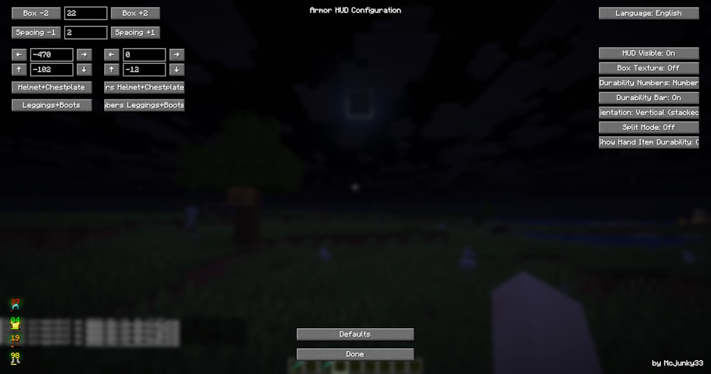 Armor Hud by Mcjunky33 - данный мод отображает вашу броню и прочность прямо на экране. Мод предлагает понятный и современный интерфейс, позволяющий вам постоянно отслеживать состояние вашей брони, не открывая инвентарь. Все элементы HUD можно легко настроить в соответствии с вашими предпочтениями, что делает его идеальным как для обычных игроков, так и для участников соревнований.